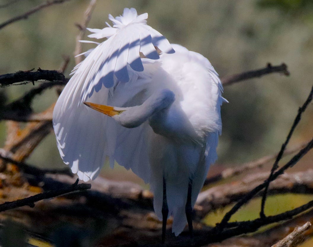 A lone Great egret, preening a wing at Hat Rock State Park in eastern Oregon last Wednesday